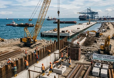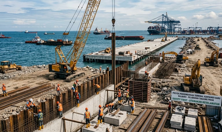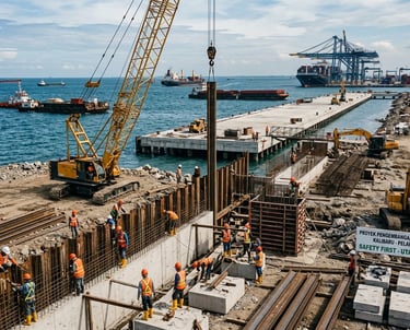 Konstruksi pelabuhan yang kuat dan efisien untuk mendukung aktivitas logistik dan transportasi laut.